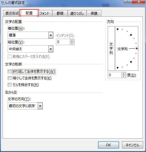 - セルの書式設定 ダイアログボックスの[配置]タブを選択します。