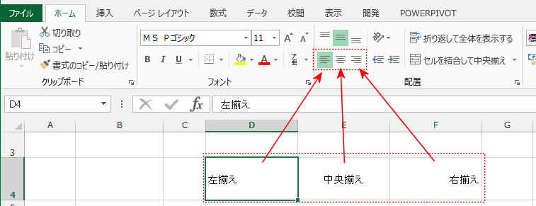 - 文字の配置の横位置ではリボンにはない機能があります。