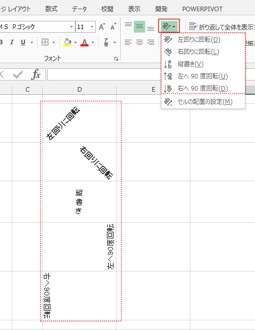 - 文字方向を使うと、左回りに回転、右回りに回転、縦書き、左へ90度回転、右へ90度回転 を設定することができます。