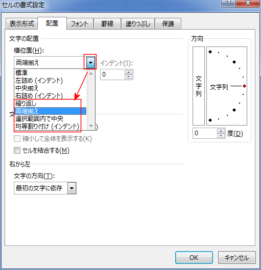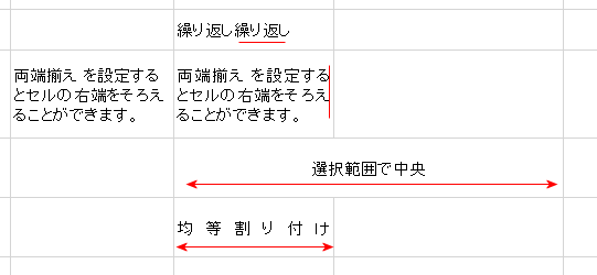 - 繰り返し、両端揃え、選択範囲内で中央、均等割り付け(インデント)などを設定することができます。