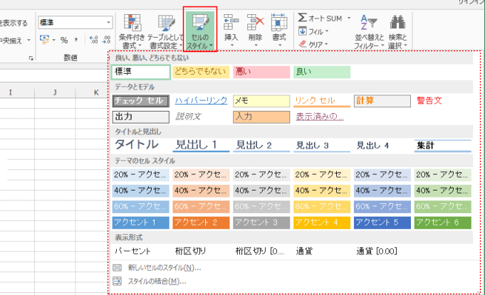- セルのスタイルをクリックすると、ドロップダウンリストに多くのスタイルが表示されます。