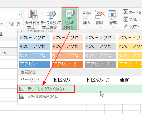 - [ホーム]タブの[セルのスタイル]→[新しいセルのスタイル]を実行します。