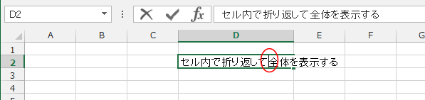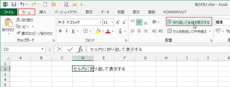 - [ホーム]タブの配置グループにある[折り返して全体を表示する]をクリックします。