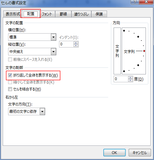 - [配置]タブの「折り返して全体を表示する」にチェックを入れます。