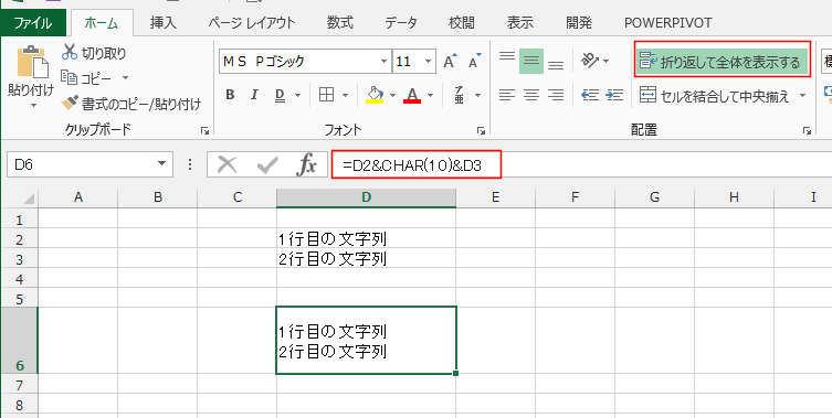 - 下図のようにD2、D3セルの文字列を改行してつなぐには、=D2&CHAR(10)&D3 と入力します。