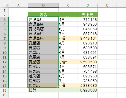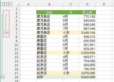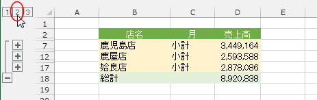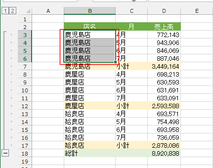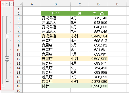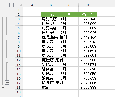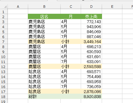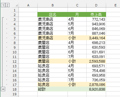 - 集計行が挿入され、店名でグループ化がされました。