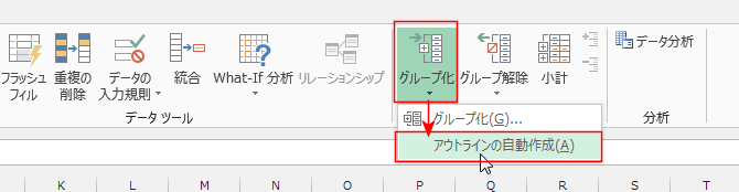 - [データ]タブの[グループ化]→[アウトラインの自動作成]を実行します。