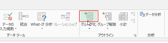 - [データ]タブのアウトライングループにある[グループ化]を実行します。