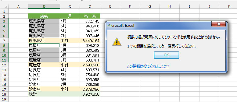 下図のようにこのコマンドは1つの範囲にしか実行できないとの説明が表示されます。