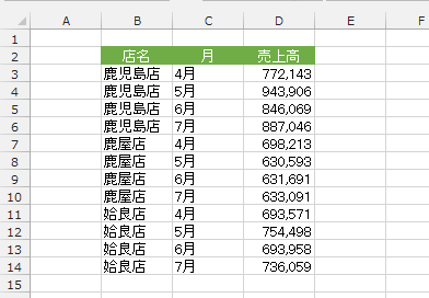 - 下図のようなデータを使って、手動でグループ化を行ってアウトラインを作成します。