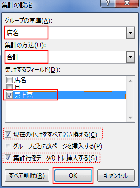- グループの基準で「店名」、集計の方法で「合計」、集計するフィールドで「売上高」が選択されているのを確認します。