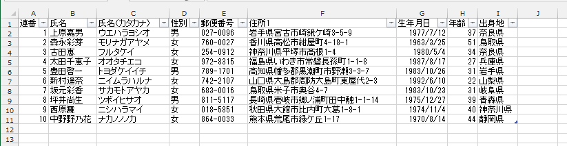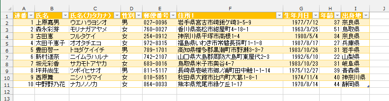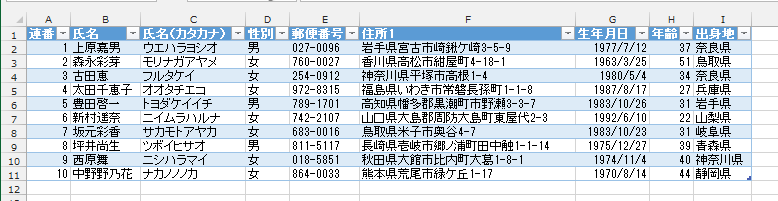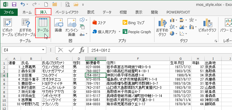 - データ範囲がテーブルに変換され、テーブルスタイルが適用されました。