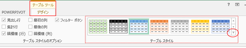 - [デザイン]タブのテーブルスタイルグループに準備されたスタイルがリスト表示されます。