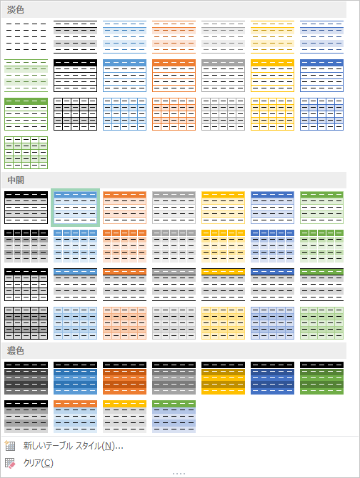 - リストを展開すると、淡色、中間、濃色の3つに分類されてテーブルスタイルが表示されます。
