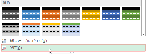 - [デザイン]タブのテーブルスタイルの最下端にある[クリア]を選択します。