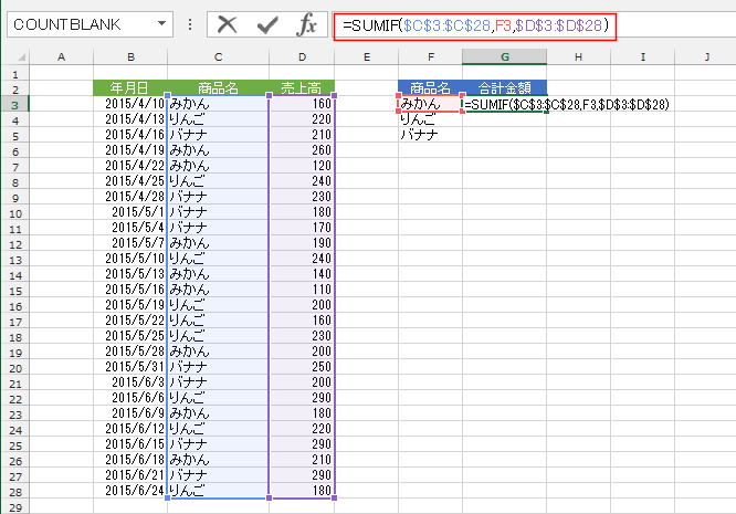 - G3セルを選択して、 =SUMIF($C$3:$C$28,F3,$D$3:$D$28) と入力します。