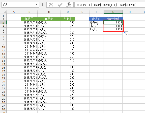 - G3セルの数式を確定後、下方向へコピーすると下図のように各商品ごとの合計を求めることができました。