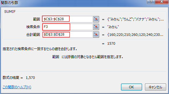 - 関数の挿入を使って数式を作成する場合は、下図のように範囲、検索条件、合計範囲を指定します。