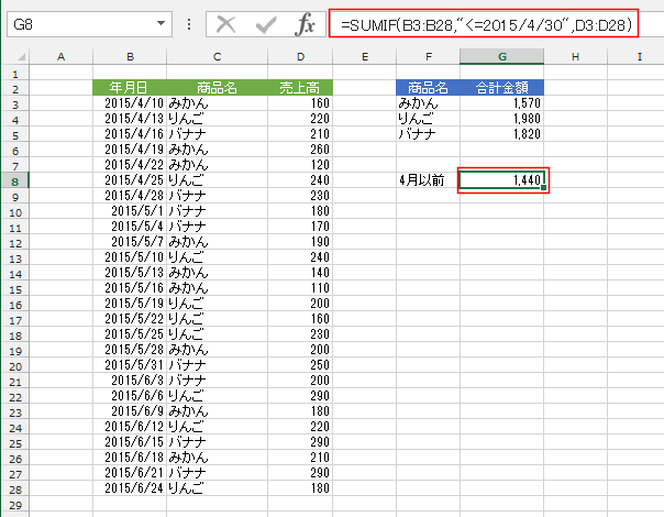 - G8セルを選択して、 =SUMIF(B3:B28,"<=2015/4/30",D3:D28) と数式を作成しました。