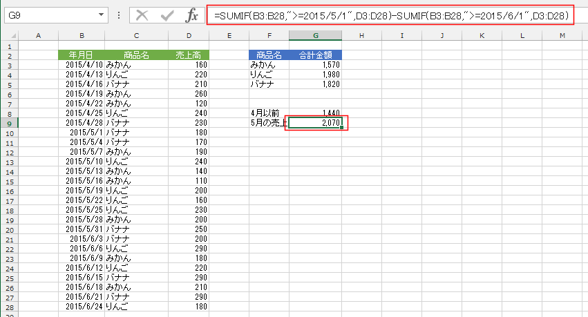 - G9セルを選択して、 =SUMIF(B3:B28,">=2015/5/1",D3:D28)-SUMIF(B3:B28,">=2015/6/1",D3:D28) と数式を作成しました。
