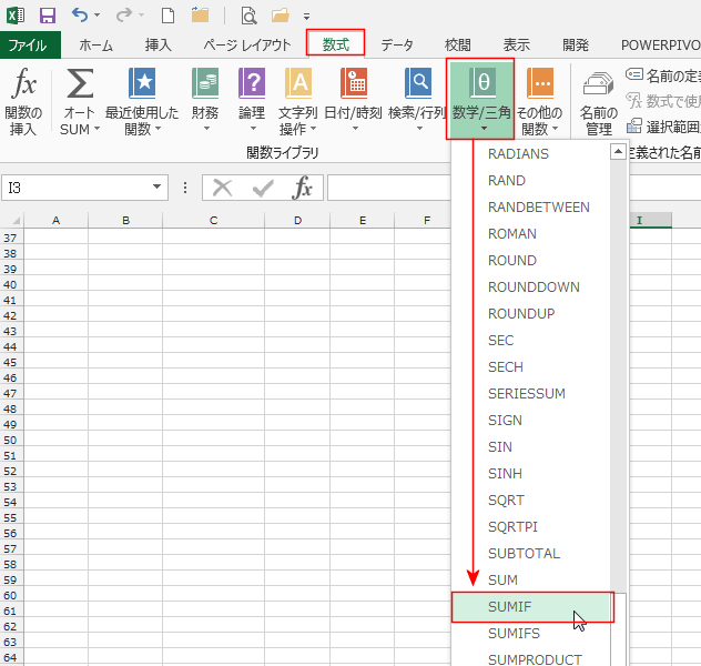 - SUMIF関数は[数式]タブの[数学/三角]→[SUMIF] で挿入することもできます。