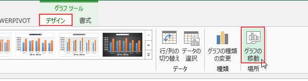 - グラフを選択して、グラフツールの[デザイン]タブの[グラフの移動]を実行します。
