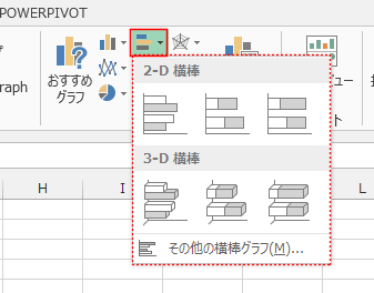- 2-D横棒と3-D横棒のグループに集合横棒、積み上げ横棒、100%積み上げ横棒などがあります。