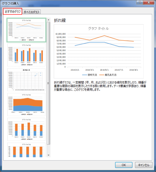 - すべてのグラフ タブを選択すると作成可能なグラフがプレビューされ、選択するとグラフやチャートが作成できます。