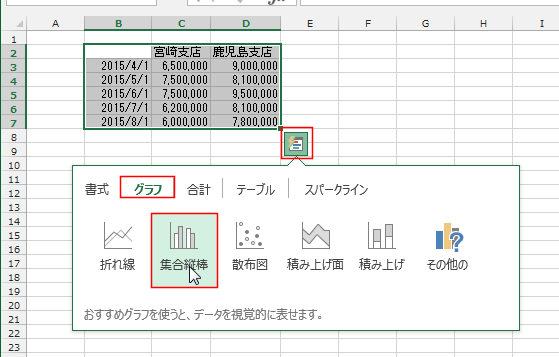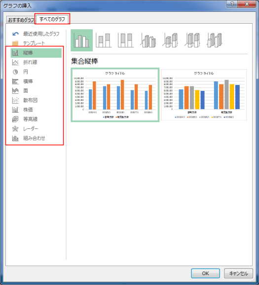 表示されたグラフのリストから「集合縦棒」を選択します。