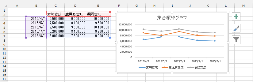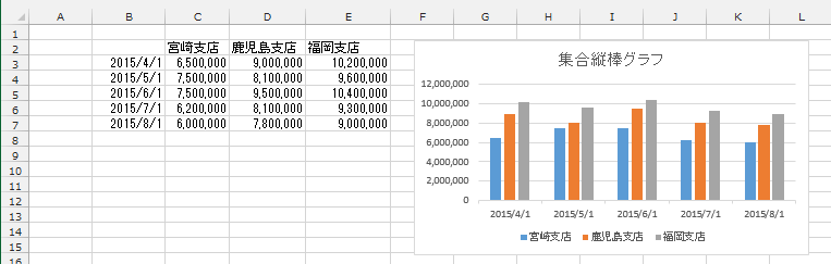 - 下図のようなデータから集合縦棒グラフを作成しました。これを他のグラフに変更してみます。
