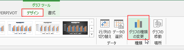 - グラフツールのデザインタブの[グラフの種類の変更]を実行します。