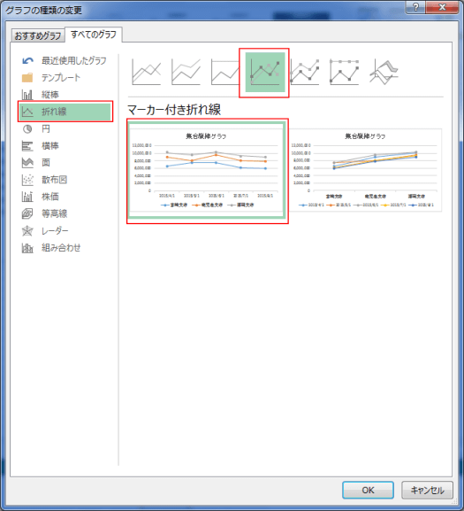 [折れ線]を選択して、「マーカー付き折れ線」を選択しました。