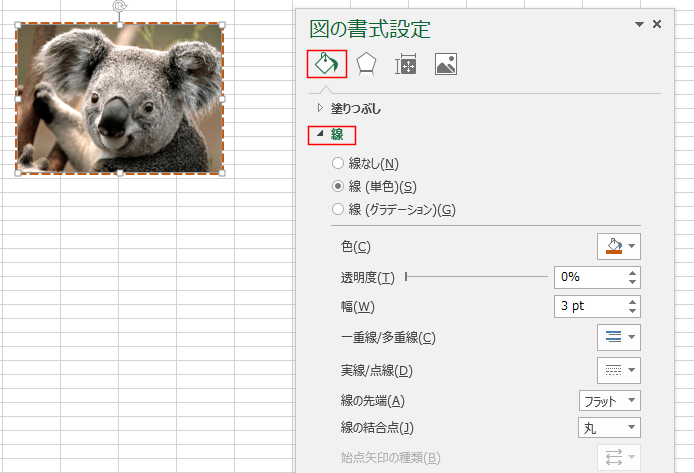 [塗りつぶしと線]を選択して、[線]を選択すると、上記で設定した枠線の設定をこのウィンドウでまとめて行うことができます。