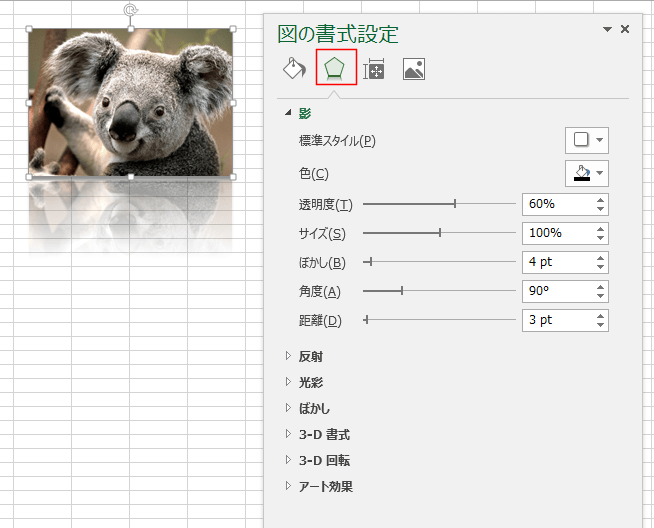 [効果]を選択して、[影]を選択すると、上記で設定した枠線の設定をこのウィンドウで行うことができます。