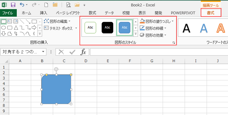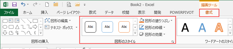 [書式]タブの図形のスタイルグループで図形のスタイルや塗りつぶしの色、枠線の書式、図形の効果を設定することができます。