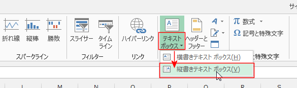 - 縦書きテキストボックスは[挿入]タブの[テキストボックス]→[縦書きテキストボックス]から挿入することができます。