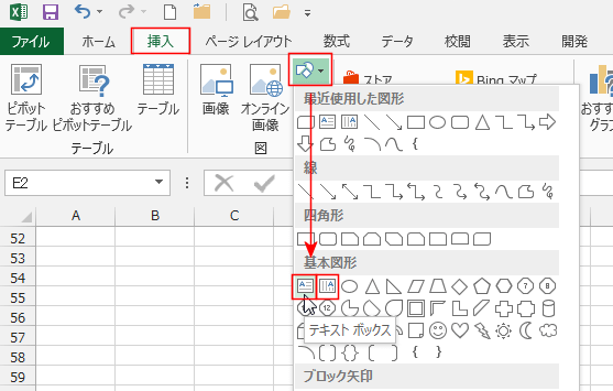 - [挿入]タブの[図形]をクリックすると、使用できる図形がリスト表示されます。