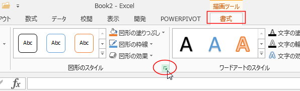 - テキストボックスを選択して、描画ツールの図形スタイルグループのダイアログボックス起動ツールをクリックします。