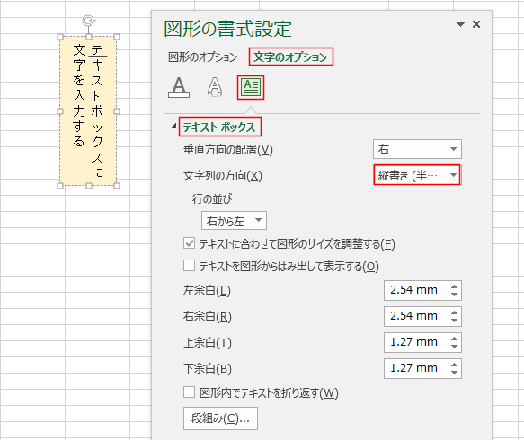 - 下図は[文字のオプション]を選択して、テキストボックスの文字列の方向を「縦書き(半角文字も含む)」を設定した状態です。