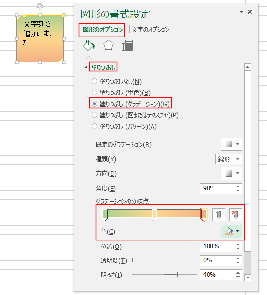 下図は[図形のオプション]を選択して、「塗りつぶし(グラデーション)」を設定した状態です。