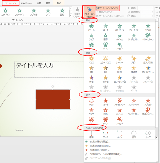 表示されたドロップダウンリストには、開始、強調、終了、アニメーションの軌跡といったグループに分けられた効果が設定できることが分かります。