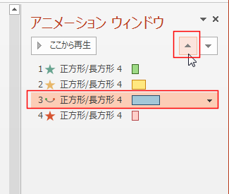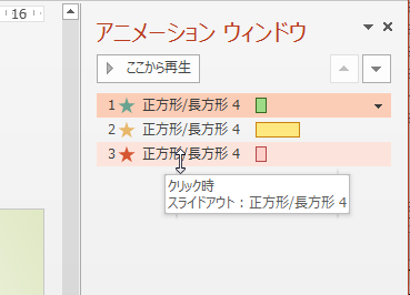 なお、[アニメーション]タブの[アニメーション ウィンドウ]をクリックしてオンにしていますので、アニメーション ウィンドウに下図のように表示されます。