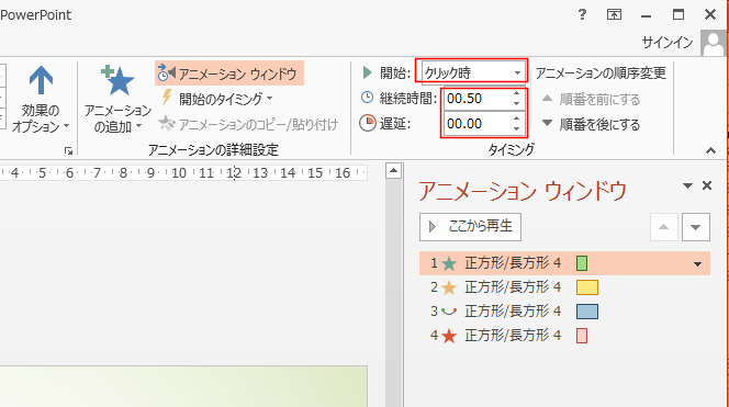 アニメーションウィンドウで各アニメーション効果を選択して、アニメーションタブのタイミング グループで設定ができます。