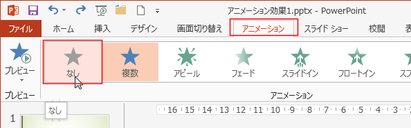 - アニメーションの削除は[アニメーション]タブのアニメーション グループの[なし]をクリックします。