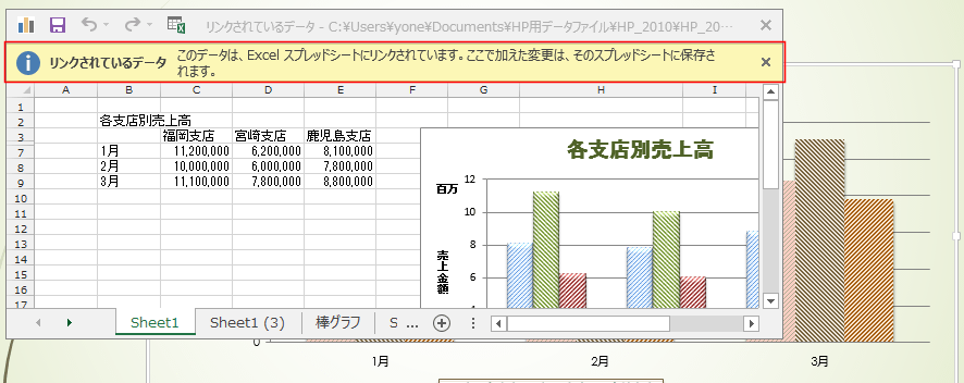 | 元の書式を保持しデータをリンク | Excelのブック(ファイル)とリンクされた状態で貼り付けられます。 Excelでグラフが変更されるとPowerPointのグラフも変更されます。 また、PowerPointでグラフが変更されるとExcelのグラフも変更されます。 グラフの書式はExcelでの書式が適用されます。 |