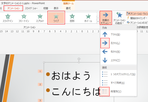[効果のオプション]で「左から」と「段落別」に設定しました。