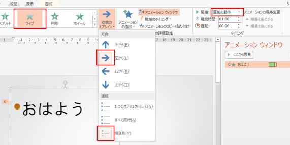 [アニメーション]タブで[ワイプ]を選択しました。