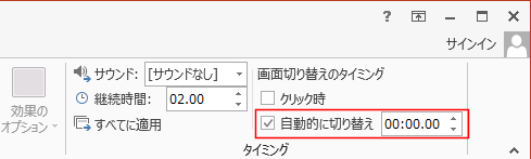 - [画面切り替え]タブのタイミング グループにある画面切り替えタイミングで「自動的に切り替え」にチェックを入れ、時間を設定します。