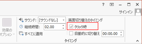 - [画面切り替え]タブのタイミング グループにある画面切り替えタイミングで「クリック時」にチェックを入れます。