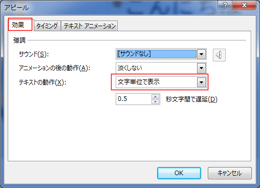 - [効果]タブのテキストの動作で「文字単位で表示」を選択します。